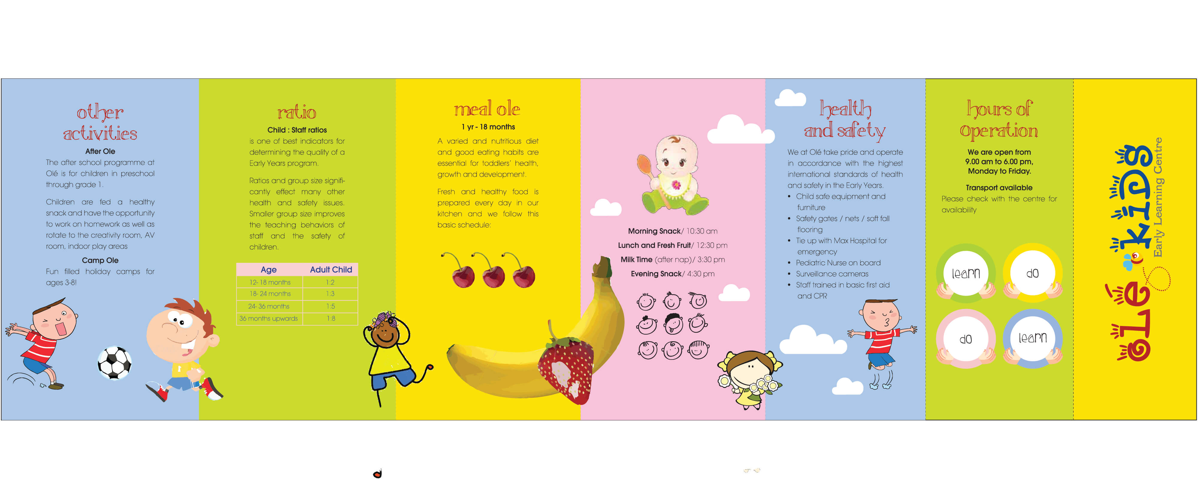 How does a pre-school communicate it’s value system and ethos with parents of tiny tots? Ole Kids, a pre-school in Gurgaon came to us with this question and we rose to the challenge. We planned, we illustrated and we coloured (within the lines- just like our teachers taught us) to create a vibrant brochure and varied marketing collateral. We envisioned the brand’s communication strategy as something fun and colourful. To differentiate Ole Kids from other pre-schools, we knew we had to strike a balance between listing the services and facilities and depicting the love children would receive here. We achieved this with simple, to-the-point messaging, a bright colour scheme and illustrative graphics of iconic childhood moments.